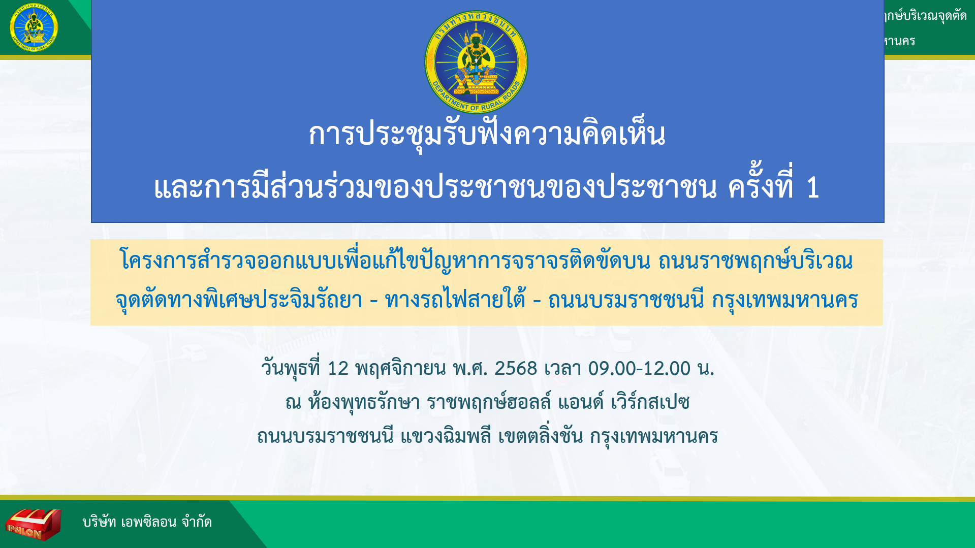 ตามที่กรมทางหลวงชนบท โดยสำนักสำรวจและออกแบบ มีความประสงค์จะดำเนินโครงการสำรวจออกแบบเพื่อแก้ไขปัญหาการจราจรติดขัดบนถนนราชพฤกษ์ บริเวณจุดตัดทางพิเศษประจิมรัถยา - ทางรถไฟสายใต้ – ถนนบรมราชชนนี กรุงเทพมหานคร ซึ่งในขอบเขตของการดำเนินงานโครงการจะต้องจัดประชุมรับฟังความคิดเห็นและการมีส่วนร่วมของประชาชน เพื่อเป้นการประชาสัมพันธ์และนำเสนอข้อมูลรายละเอียดโครงการที่ถูกต้อง เปิดโอกาสให้ประชาชนผู้มีส่วนได้เสียและหน่วยงานที่เกี่ยวข้องได้มีส่วนร่วมในการนำเสนอข้อมูล ข้อเท็จจริง และข้อเสนอแนะต่าง ๆ ซึ่งจะทำให้การศึกษาและการดำเนินโครงการตรงกับความต้องการของประชาชนในพื้นที่มากที่สุด โดยได้จัดประชุม เมื่อวันที่ 12 พฤศจิกายน 2568 เวลา 09.00 - 12.00 น. ณ ห้องพุทธรักษา ราชพฤกษ์ฮอลล์ แอนด์ เวิร์กสเปซ ถนนบรมราชชนนี แขวงฉิมพลี เขตตลิ่งชัน กรุงเทพมหานคร
