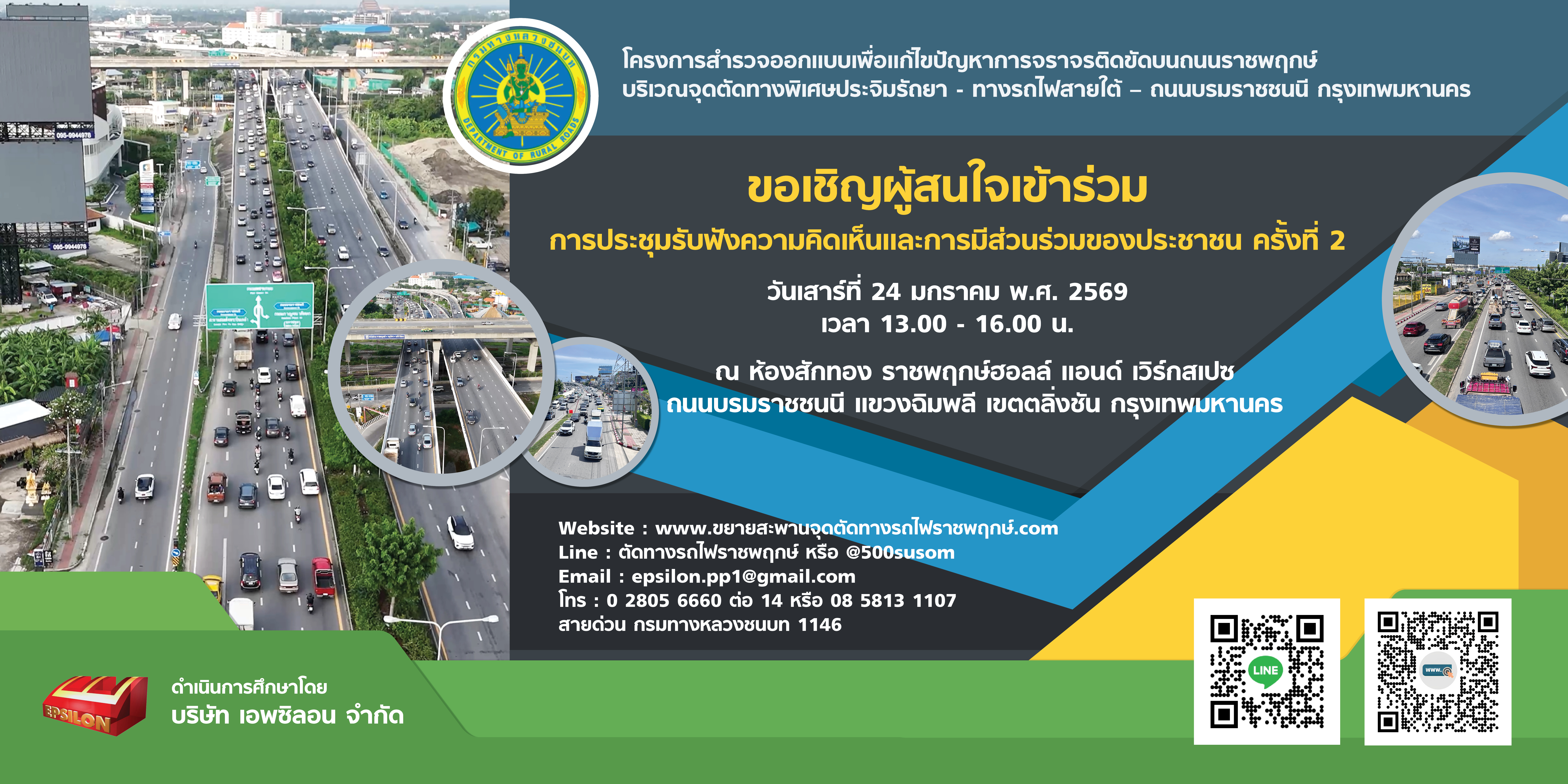 สำนักสำรวจและออกแบบ กรมทางหลวงชนบท ร่วมกับผู้ให้บริการงานจ้างออกแบบได้กำหนดจัดประชุมรับฟังความคิดเห็นและการมีส่วนร่วมของประชาชน ครั้งที่ 2 ในวันเสาร์ที่ 24 มกราคม 2569 เวลา 13.00 - 16.00 น. ณ ห้องสักทอง ราชพฤกษ์ฮอลล์ แอนด์ เวิร์กสเปซ ถนนบรมราชชนนี แขวงฉิมพลี เขตตลิ่งชัน กรุงเทพมหานคร