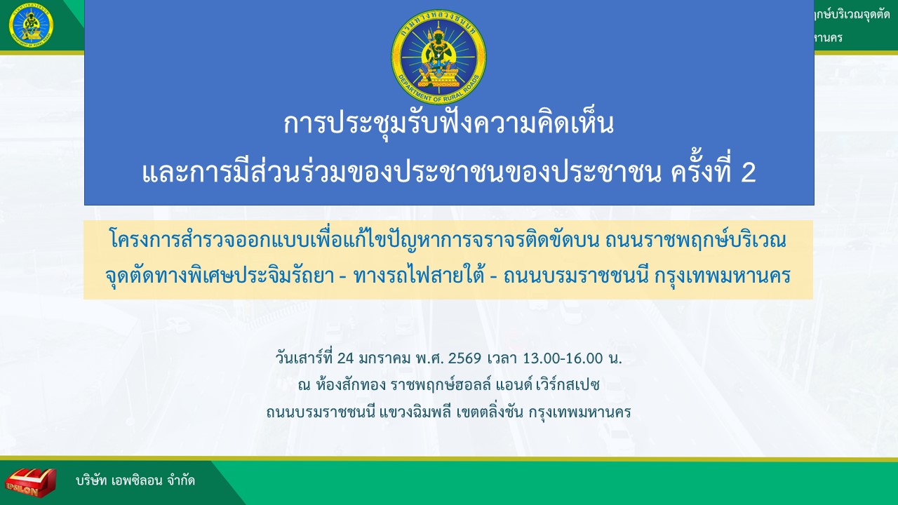 ตามที่ กรมทางหลวงชนบท โดยสำนักสำรวจและออกแบบ ได้ว่าจ้างบริษัท เอพซิลอน จำกัดเป็นผู้ให้บริการงานจ้างออกแบบ โครงการสำรวจออกแบบเพื่อแก้ไขปัญหาการจราจรติดขัดบนถนนราชพฤกษ์บริเวณจุดตัดทางพิเศษประจิมรัถยา - ทางรถไฟสายใต้ - ถนนบรมราชชนนี กรุงเทพมหานคร ซึ่งในขอบเขตของการดำเนินงานโครงการจะต้องจัดประชุมรับฟังความคิดเห็นและการมีส่วนร่วมของประชาชน เพื่อเป็นการนำเสนอข้อมูลความก้าวหน้าและผลการดำเนินงานโครงการ รูปแบบการพัฒนาโครงการ เปิดโอกาสให้ประชาชนผู้มีส่วนได้เสีย และหน่วยงานที่เกี่ยวข้องได้มีส่วนร่วมในการให้ข้อคิดเห็น และข้อเสนอแนะ เพื่อให้การดำเนินงานโครงการตรงกับความต้องการของประชาชนมากที่สุด โดยได้จัดประชุมเมื่อวันเสาร์ที่๒๔ มกราคม๒๕๙ เวลา ๑๓.๐๐ -๑๖.๐๐ น. ณ ห้องสักทอง ราชพฤกษ์ฮอลล์ แอนด์ เวิร์กสเปซ ถนนบรมราชชนนี แขวงฉิมพลี เขตตลิ่งชัน กรุงเทพมหานคร
