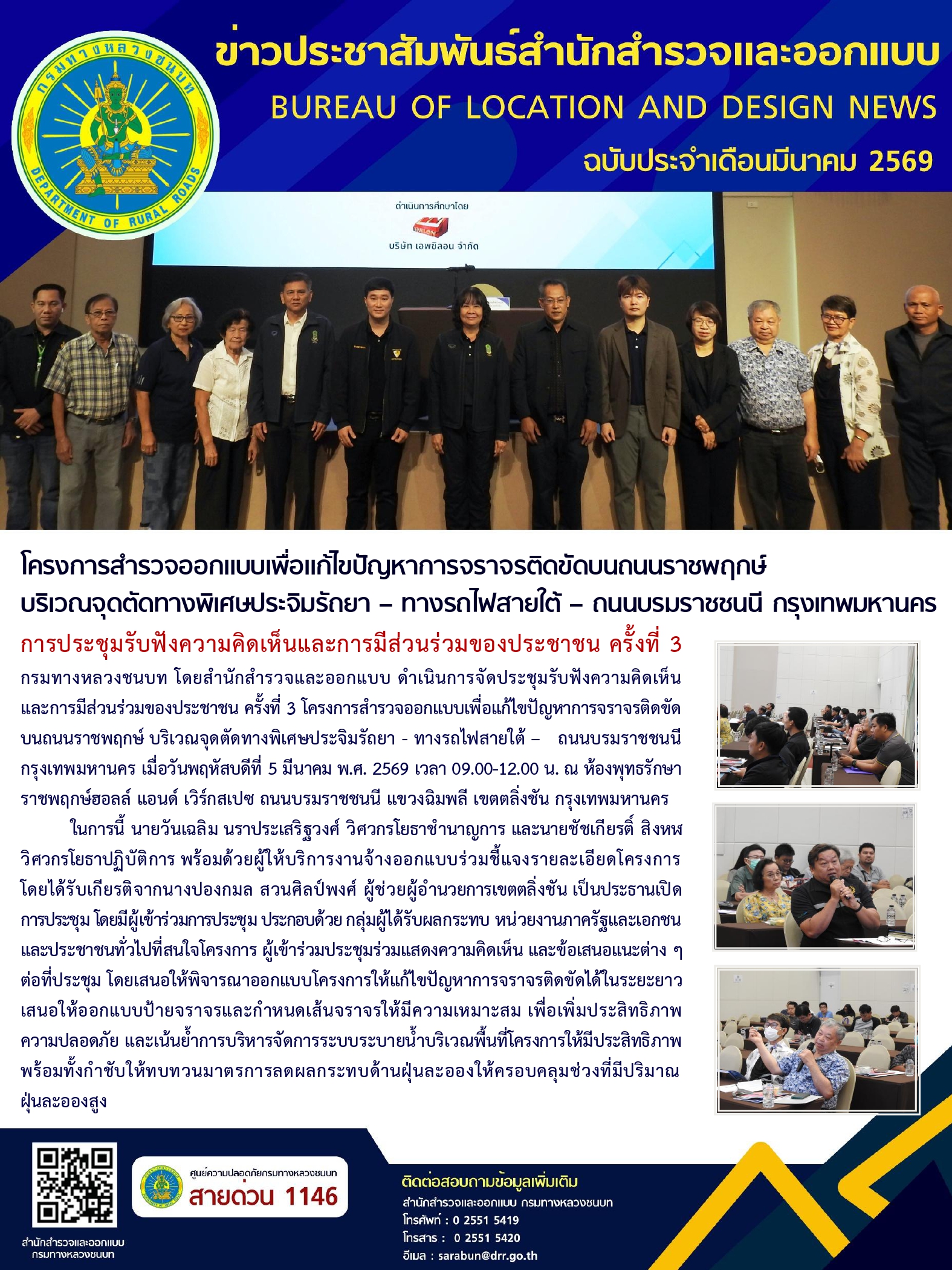 กรมทางหลวงชนบท โดยสำนักส ารวจและออกแบบ ดำเนินการจัดประชุมรับฟังความคิดเห็นและการมีส่วนร่วมของประชาชน ครั้งที่ 3 โครงการสำรวจออกแบบเพื่อแก้ไขปัญหาการจราจรติดขัดบนถนนราชพฤกษ์ บริเวณจุดตัดทางพิเศษประจิมรัถยา - ทางรถไฟสายใต้ – ถนนบรมราชชนนี